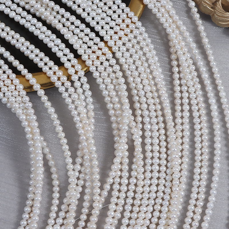 3-4 mm große, leicht unvollkommene, runde, natürliche Süßwasserperlen