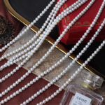 Fotorezension einer Strangkette aus weißen, natürlichen, runden Süßwasserperlen (4,5–5 mm).
