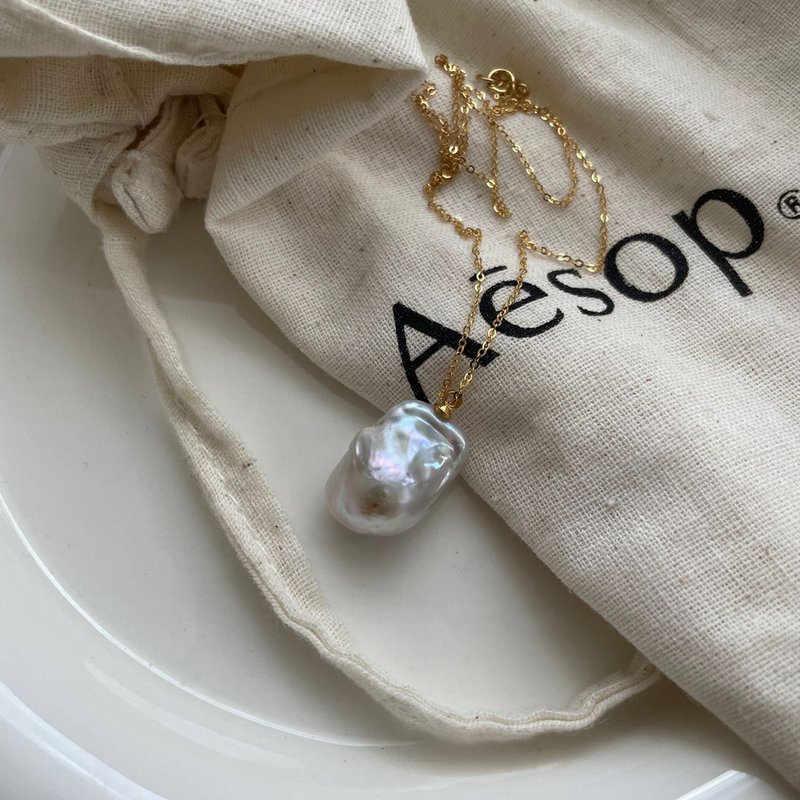Halskette mit Anhänger aus barocker Süßwasserperle, gefertigt aus 14-karätigem Gold.