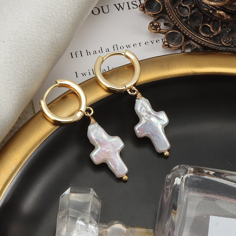 Vergoldete Kupfer-Ohrringe mit Süßwasser-Kreuz und Perle