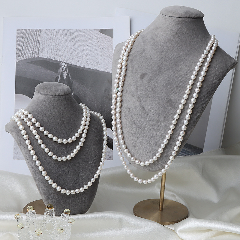 We crafted this freshwater pearl necklace with hand-knotted natural pearls on silk thread in a French vintage layered 120cm design. We hand knot each pearl to prevent friction and create two cascading strands that wrap twice or hang at full length.