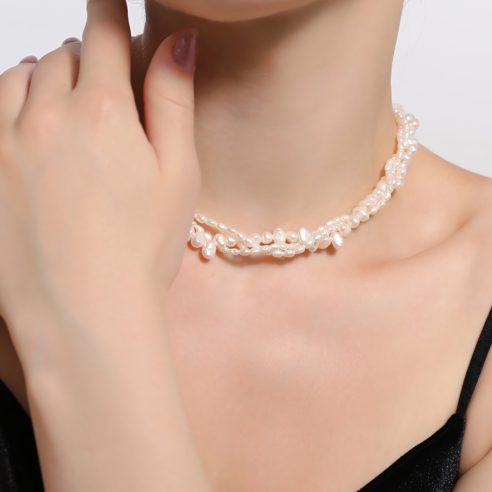 This exquisite choker features three strands of freshwater pearls, each showcasing progressively larger pearls. The adjustable gold-tone clasp adds a modern touch, making it a bold yet elegant statement piece for any formal or casual collection.